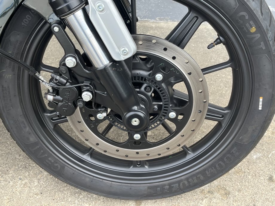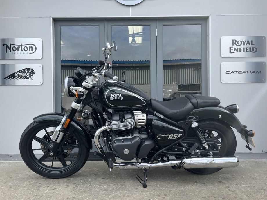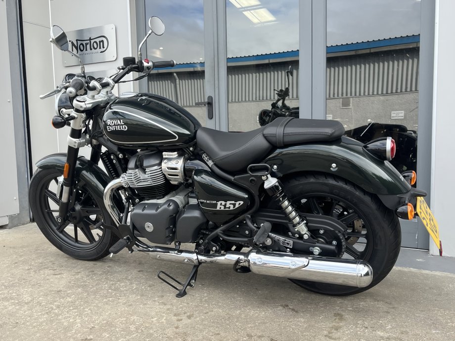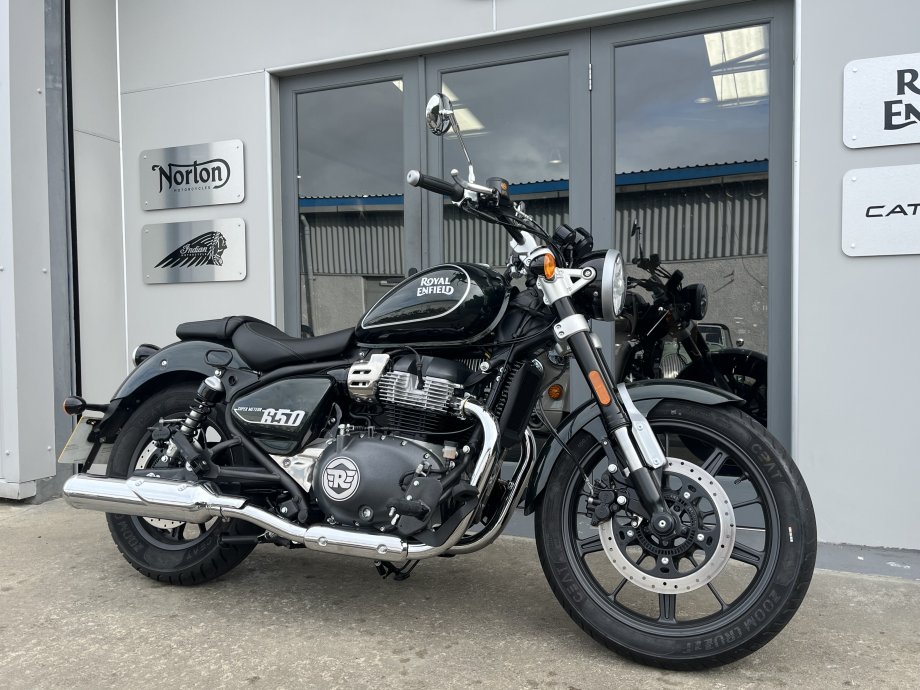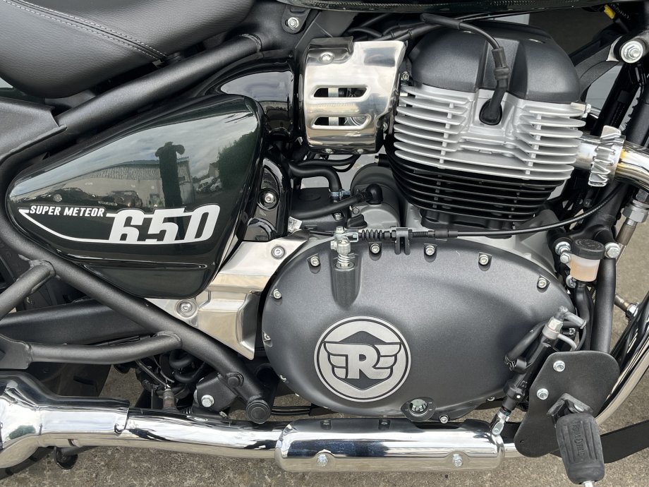 Very low mileage at just over 100 - Super Meteor 650 Twin in Metallic Astral Green. Classic Cruiser Styling with forward controls and a laid back riding position. Comfortable seat with LED lighting all round, Twin exhausts for that balanced look. Punchy 650 twin engine with nice low down Torque and a smooth 6 speed gearbox. Comes with Fuel Injection and ABS. Excellent middleweight cruiser for Royal Enfield.