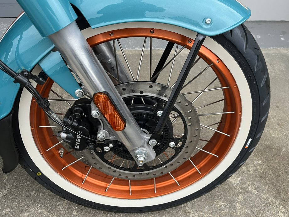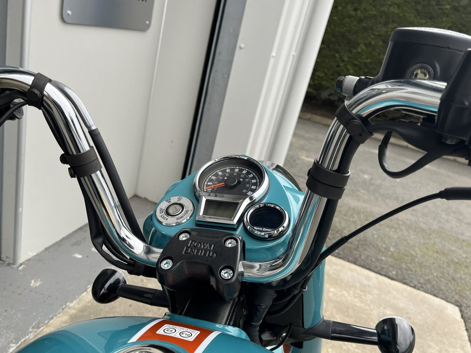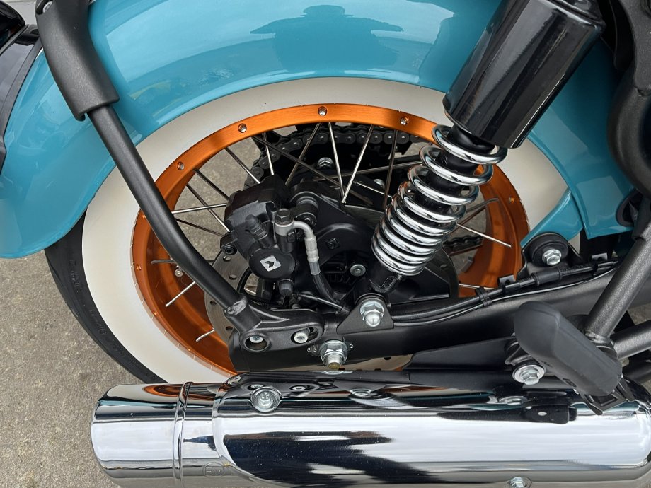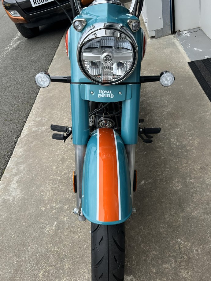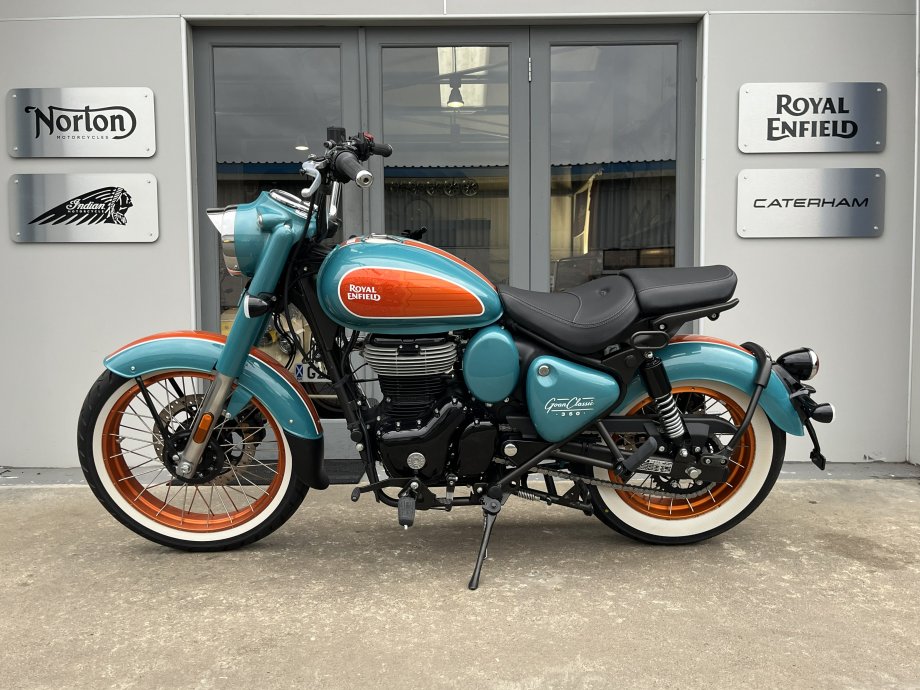The New Goan Classic 350 in Trip Teal ! Wow what a colour combination with the Lotus Flower motif on the tank this really is a stunning bike in the flesh. Comes with Anodised Orange tubeless wheels as standard and a removable rear seat section to make it a bobber look instantly! The whole thing just seems to work very well. Well proven 350cc single cylinder with 20BHP and lovely slick gearbox means that you can cruise along the beachfront with ease or take in the countryside at your leisure ! Please call for part exchange valuation and finance quote.